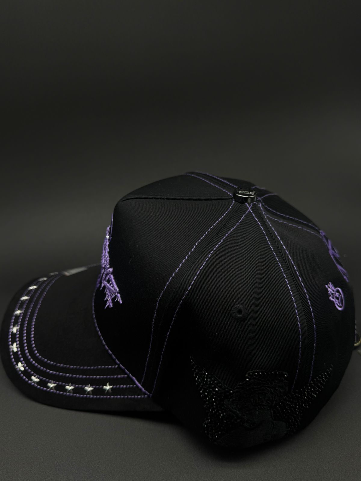 Gorra BIG BOSS X SAD BOYS con diseño premium y detalles meticulosos. Presenta bordado frontal en morado con pedrería brillante, acompañado de detalles de gamuza morado en la visera que complementan la joyería. Los laterales lucen pedrería en negro y rojo, mientras que la parte trasera destaca la icónica letra H con detalles de caras. Cada elemento está cuidadosamente ejecutado para un acabado de alta calidad que refleja el estilo distintivo de la colección.
